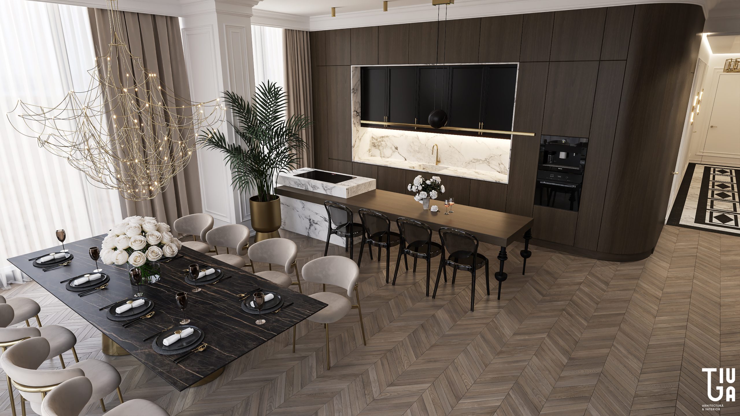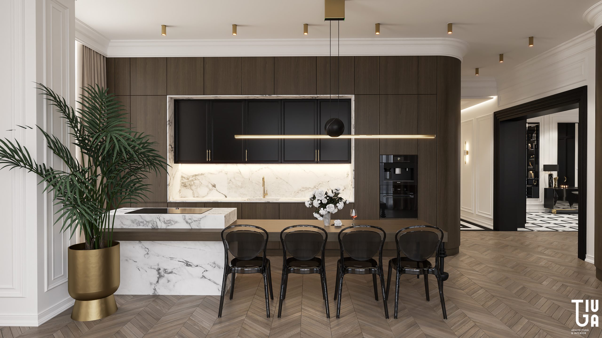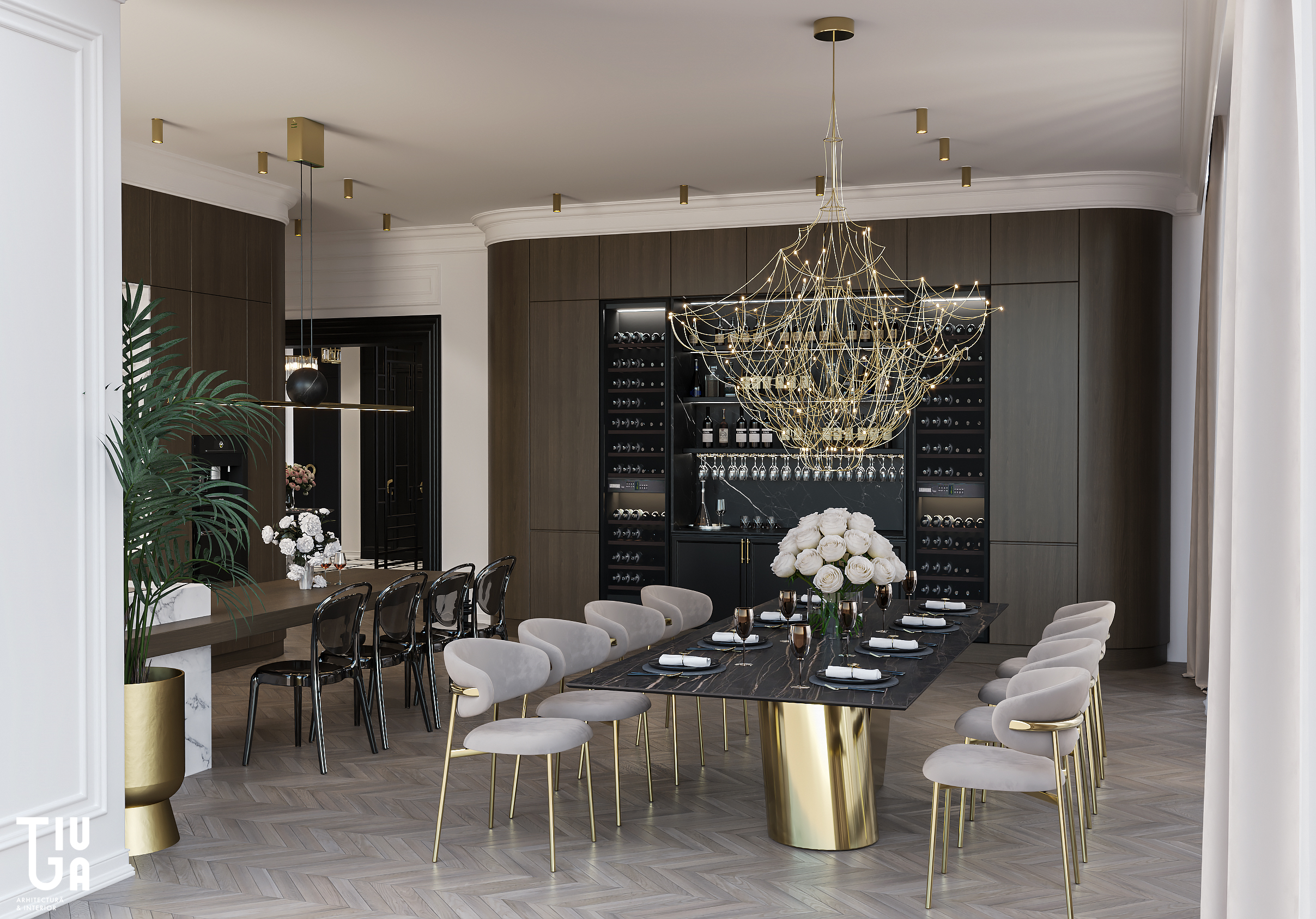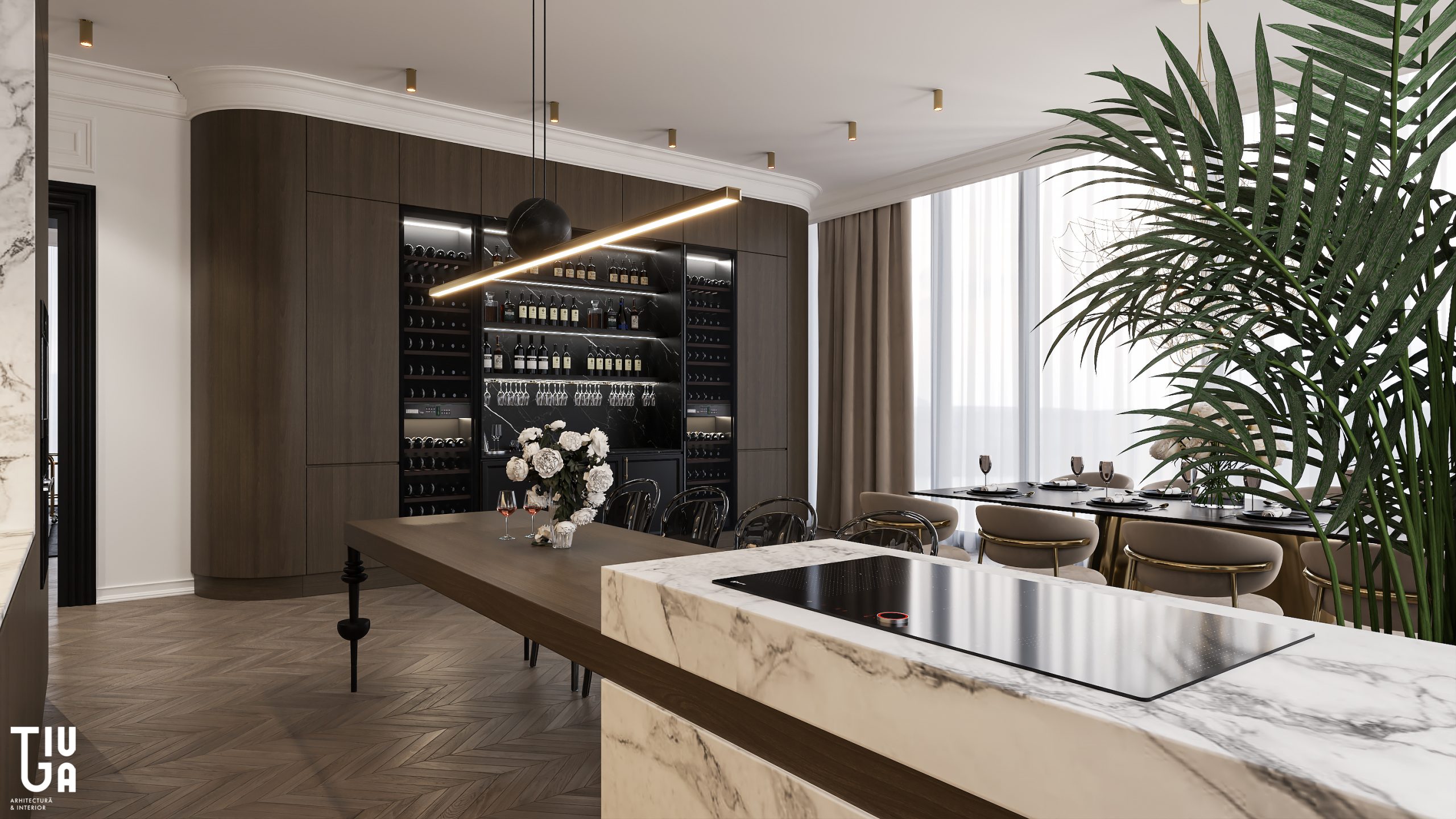 Dans la continuité du salon, la cuisine, la salle à manger et le bar à vin forment une composition unifiée de fonctionnalité et d’élégance. Un îlot monolithique en marbre et une table suspendue en bois définissent la cuisine, tandis que des meubles noirs mats et un mur à vin rehaussé de laiton ajoutent richesse et profondeur visuelle. Chaque surface est pensée, chaque élément mesuré et raffiné.