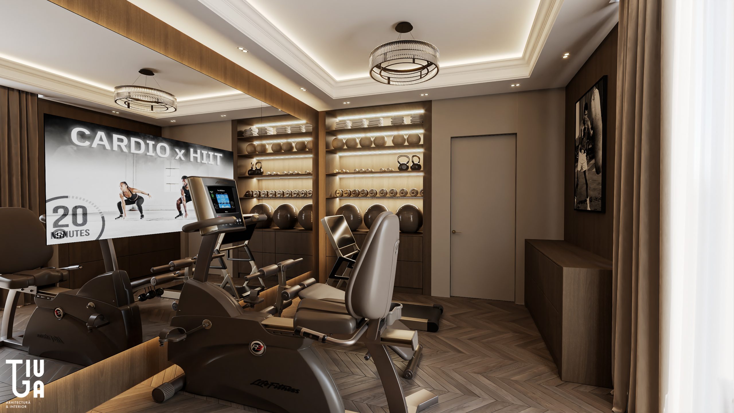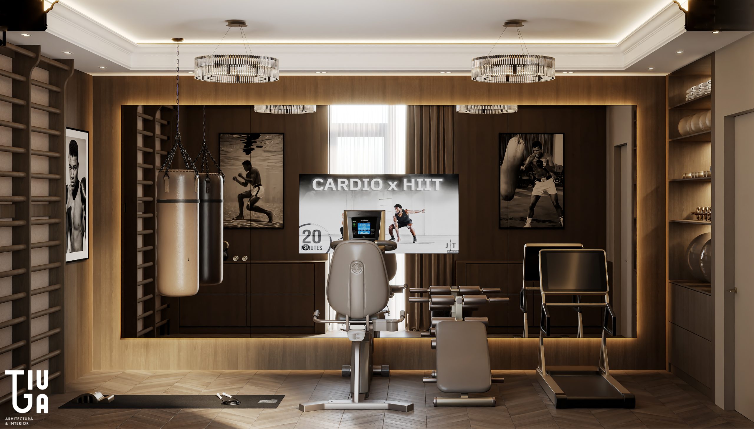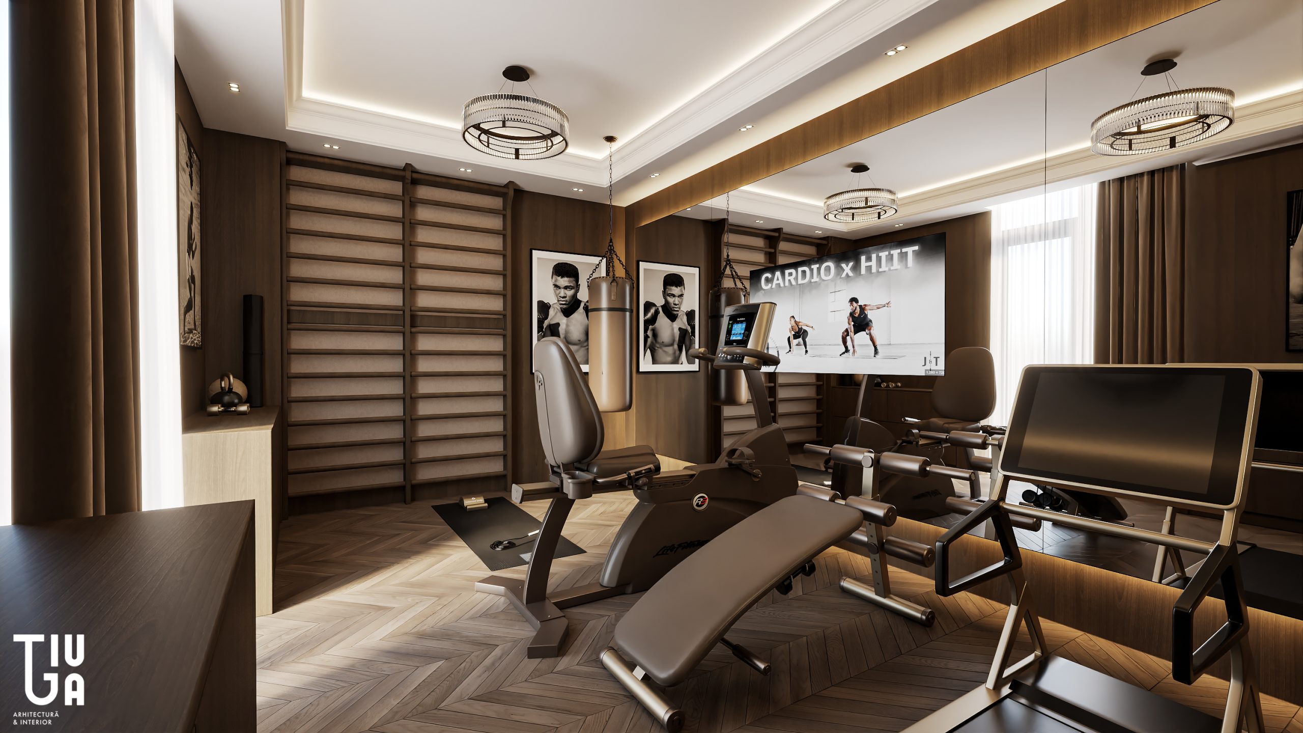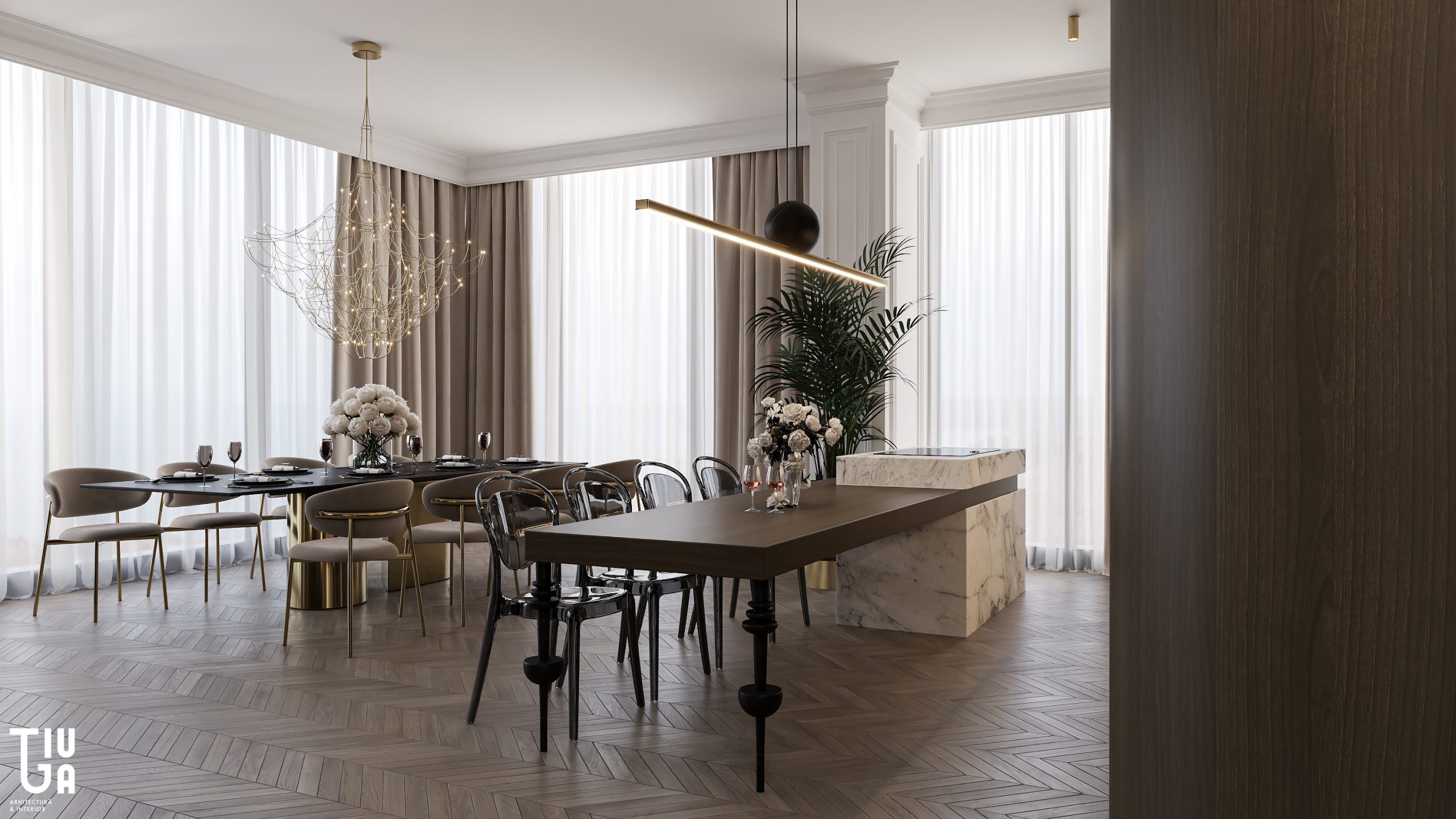 Dans la continuité du salon, la cuisine, la salle à manger et le bar à vin forment une composition unifiée de fonctionnalité et d’élégance. Un îlot monolithique en marbre et une table suspendue en bois définissent la cuisine, tandis que des meubles noirs mats et un mur à vin rehaussé de laiton ajoutent richesse et profondeur visuelle. Chaque surface est pensée, chaque élément mesuré et raffiné.