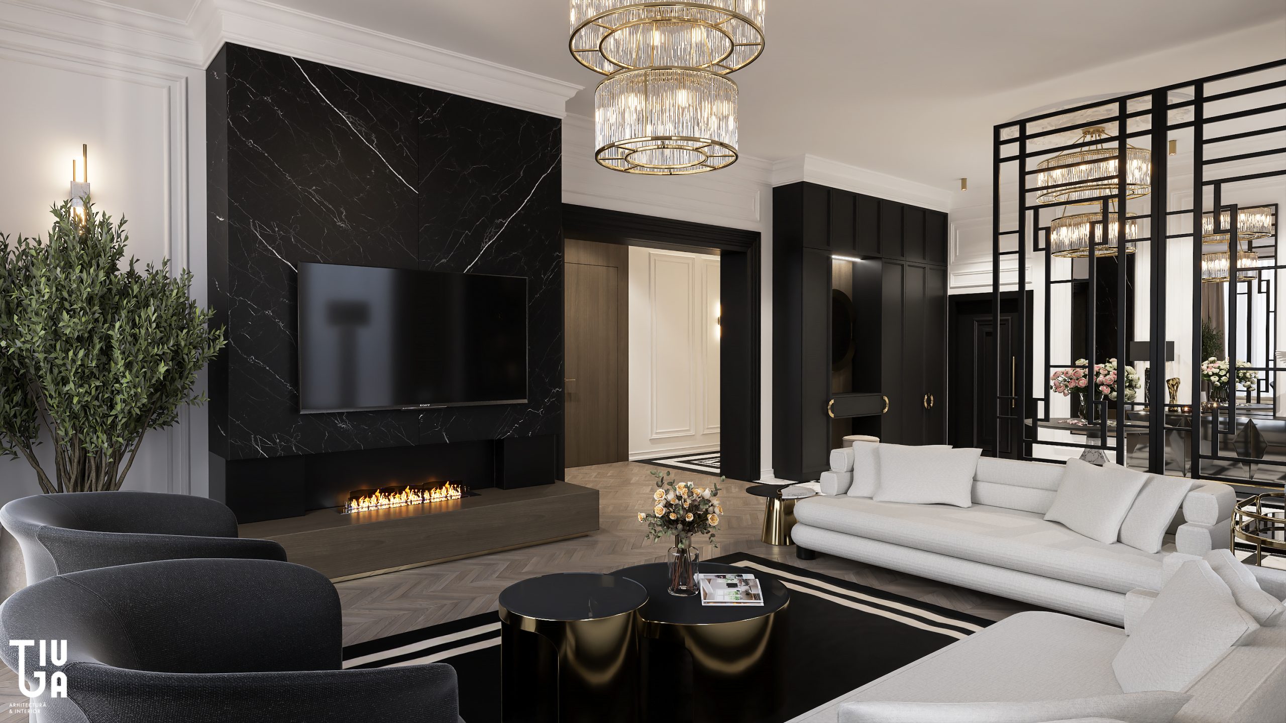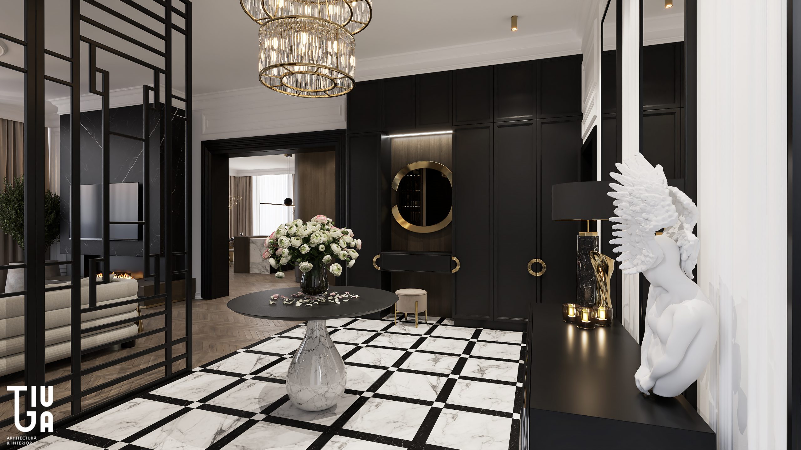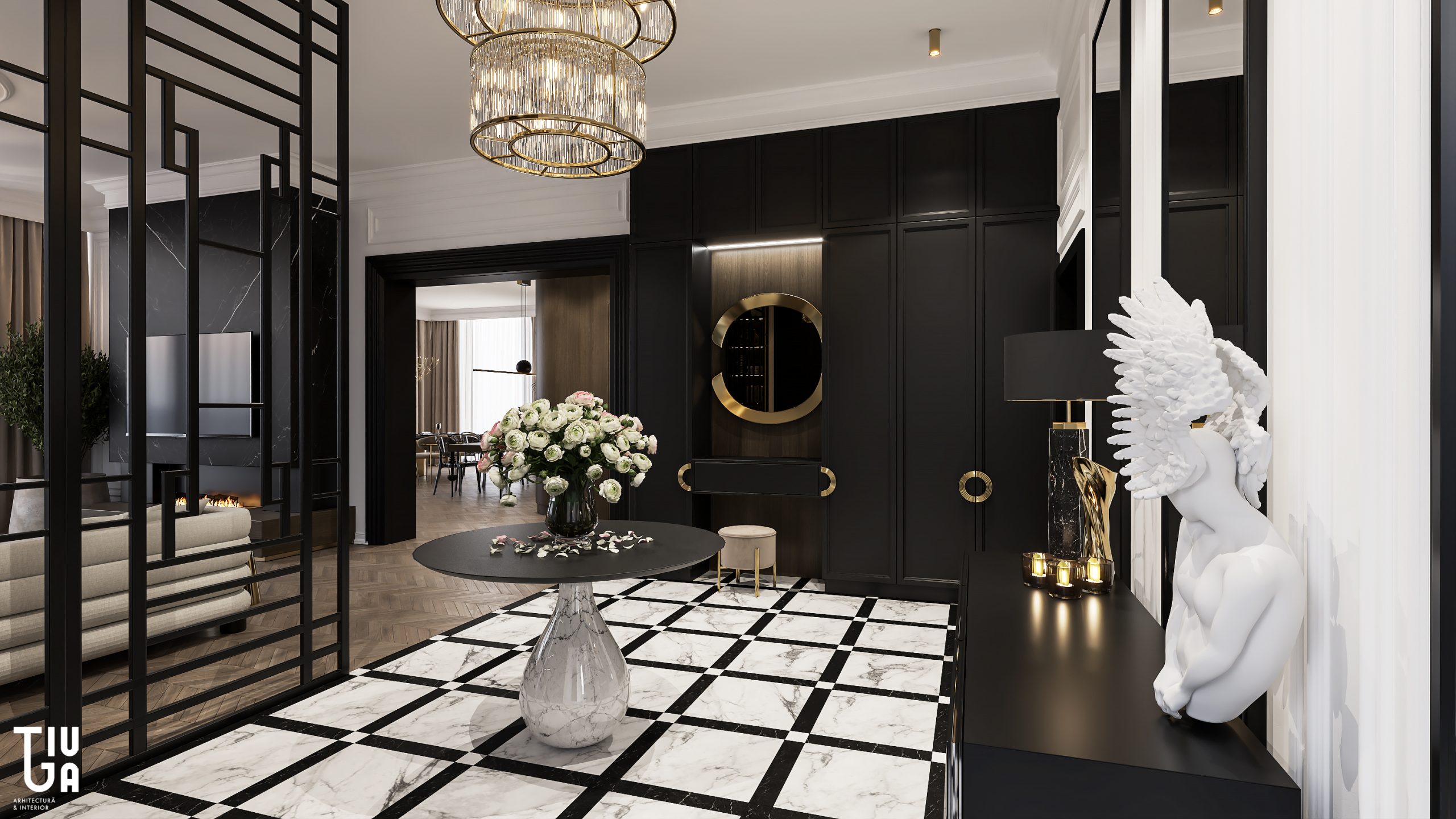 L’expérience commence dans le hall d’entrée, pensé comme une galerie sculpturale. Son sol en marbre à damier, ses murs noirs à panneaux et ses claustras métalliques sur mesure instaurent une ambiance théâtrale, rythmée par un jeu subtil d’ombres et de lumières. Cette dynamique esthétique se prolonge naturellement dans le séjour décloisonné, où la palette monochrome est adoucie par des accents en laiton et un éclairage sculptural. Une majestueuse cheminée en marbre structure l’espace, tandis que le mobilier sur mesure apporte chaleur et solennité.
