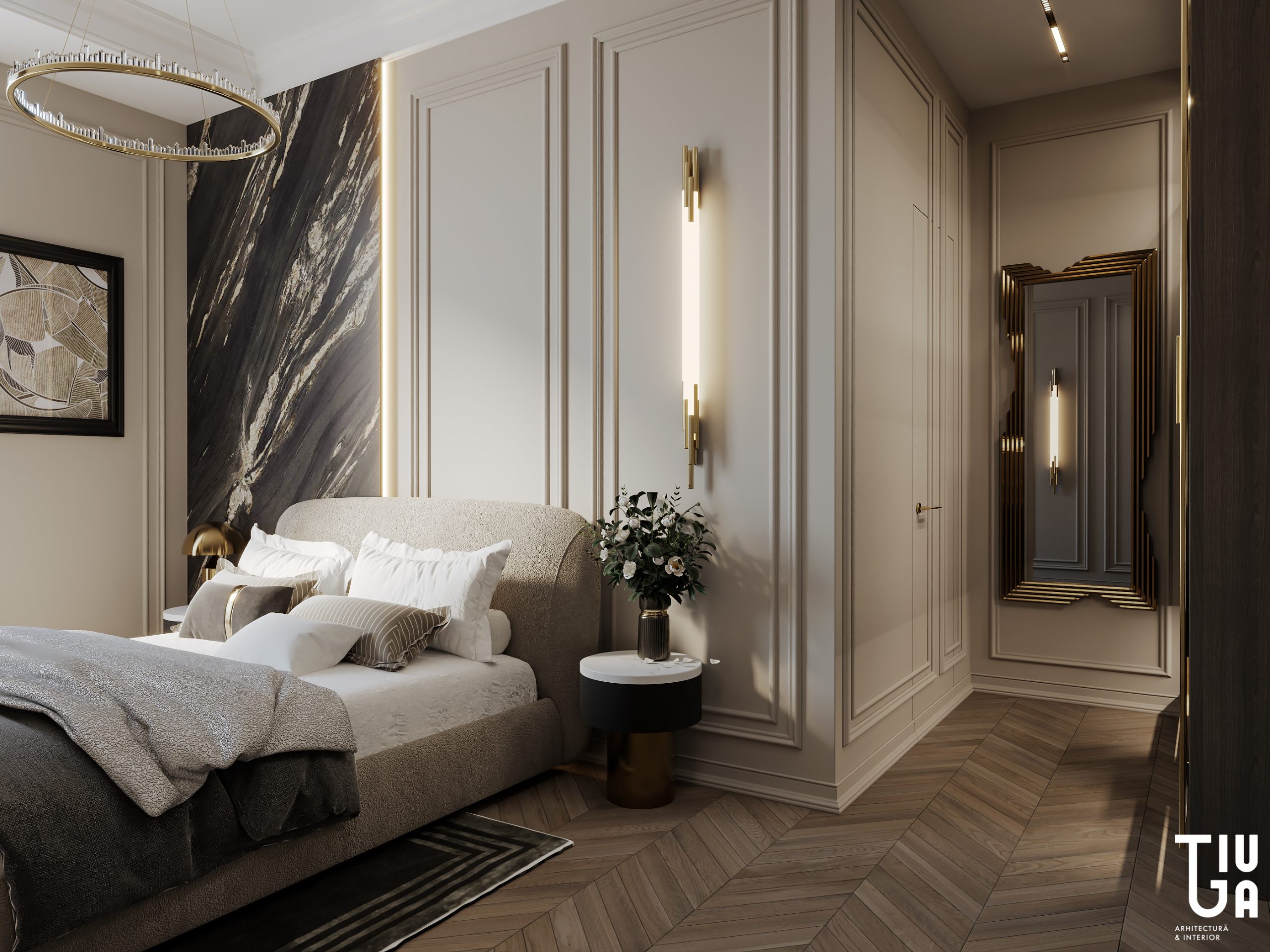 Une autre chambre exprime un raffinement jeune, mêlant structure et douceur. Mobilier sur mesure, éclairage artistique et palette apaisante composent un espace d’une clarté sereine. Une troisième suite, aux teintes douces et aux accents sculpturaux, propose une expérience tactile enrichie par des détails en laiton et une lumière d’ambiance. Sa salle de bain privée est une composition lumineuse de pierre claire et de métal brossé — un sanctuaire de géométrie calme et d’élégance naturelle.