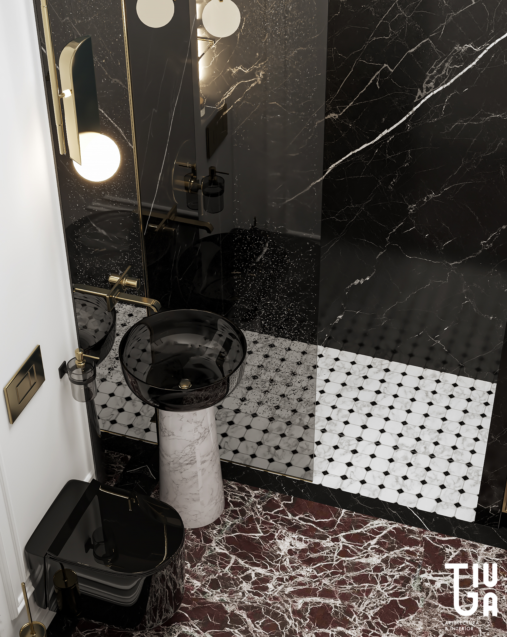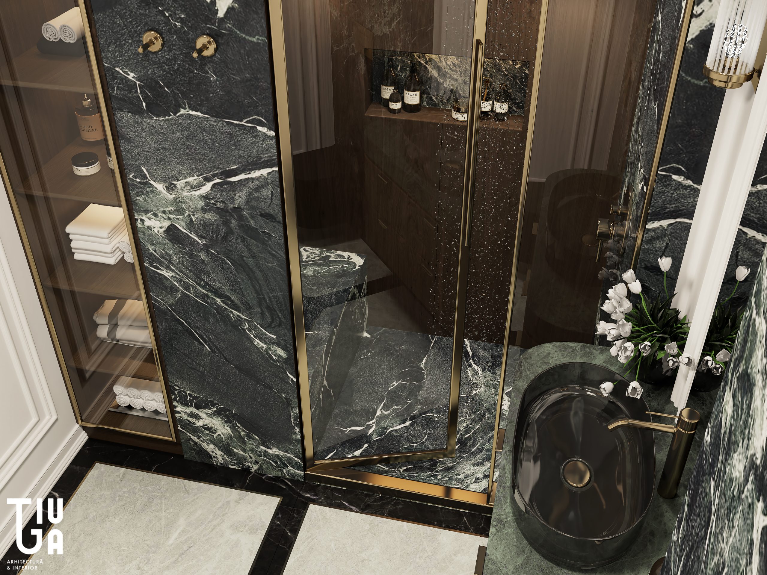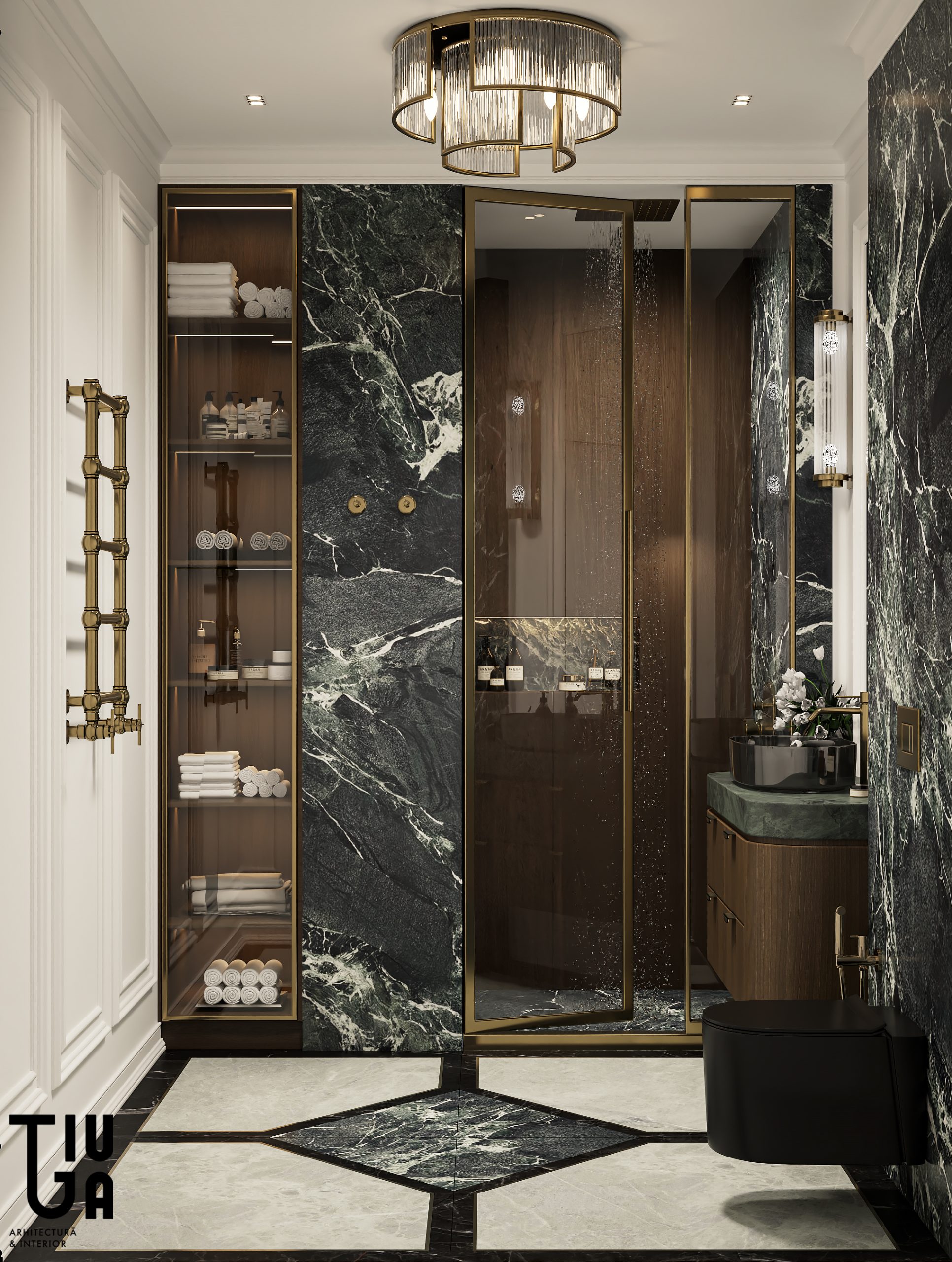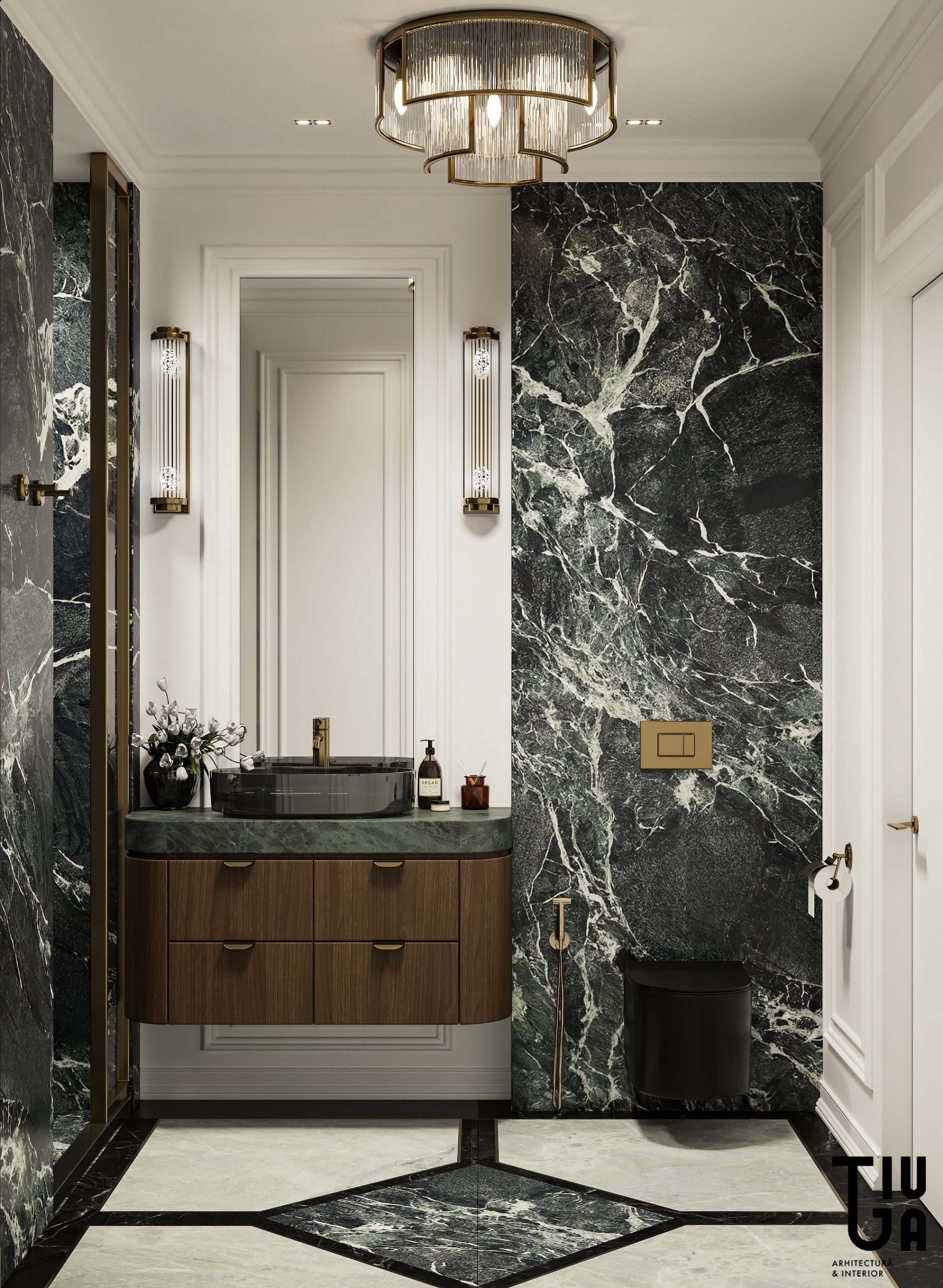 La salle d’eau et les toilettes invités poursuivent le récit d’une sobriété sculptée, conjuguant contrastes marqués entre textures sombres et marbre, éclairages délicats et robinetterie en laiton. Ces espaces secondaires bénéficient du même soin curatorial que les zones de vie principales.