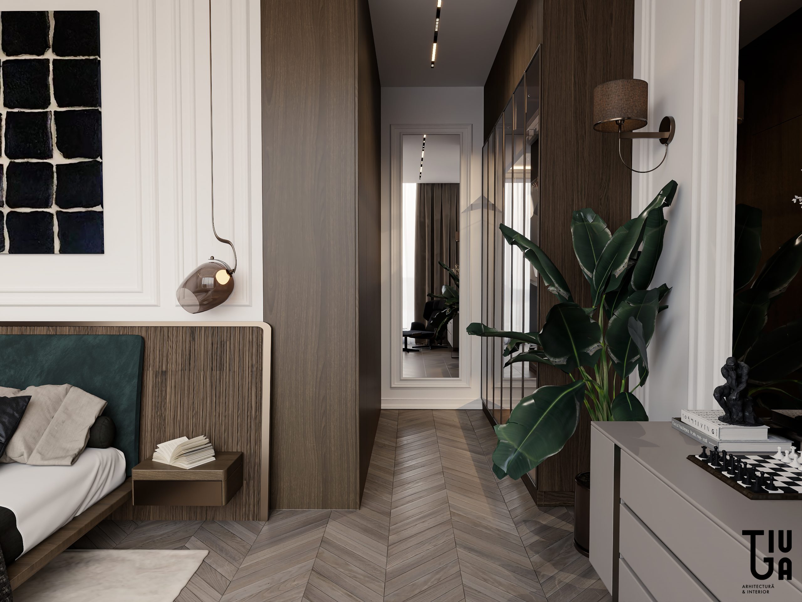 Les quartiers privés sont conçus comme des sanctuaires individuels, chacun affirmant une identité matérielle et spatiale singulière. L’une des suites se distingue par sa profondeur et sa symétrie — un équilibre savant entre textures, boiseries sur mesure et détails classiques. La salle de bain attenante offre un contraste méditatif: marbre sombre, pureté géométrique et baignoire autoportante, véritable sculpture centrale.