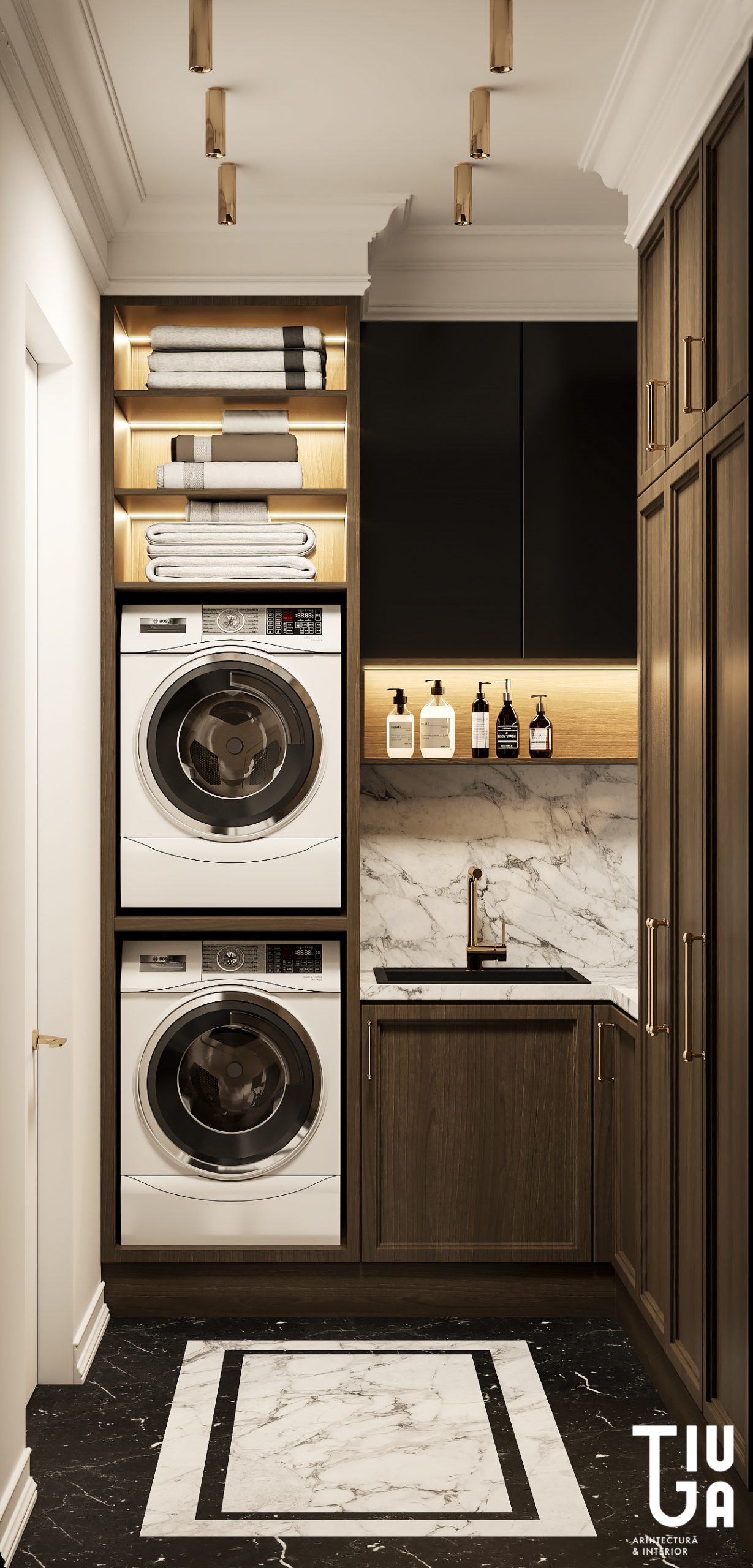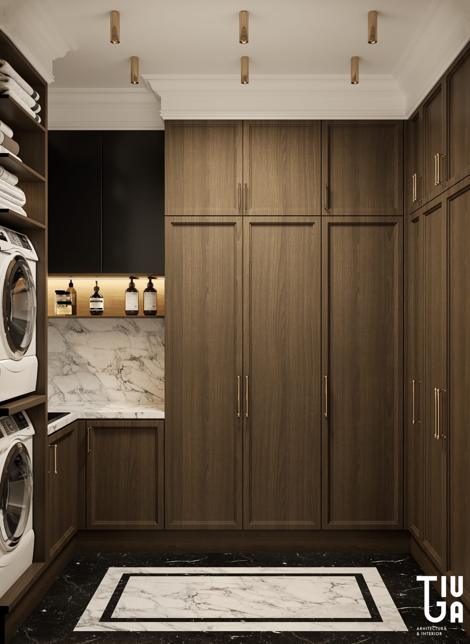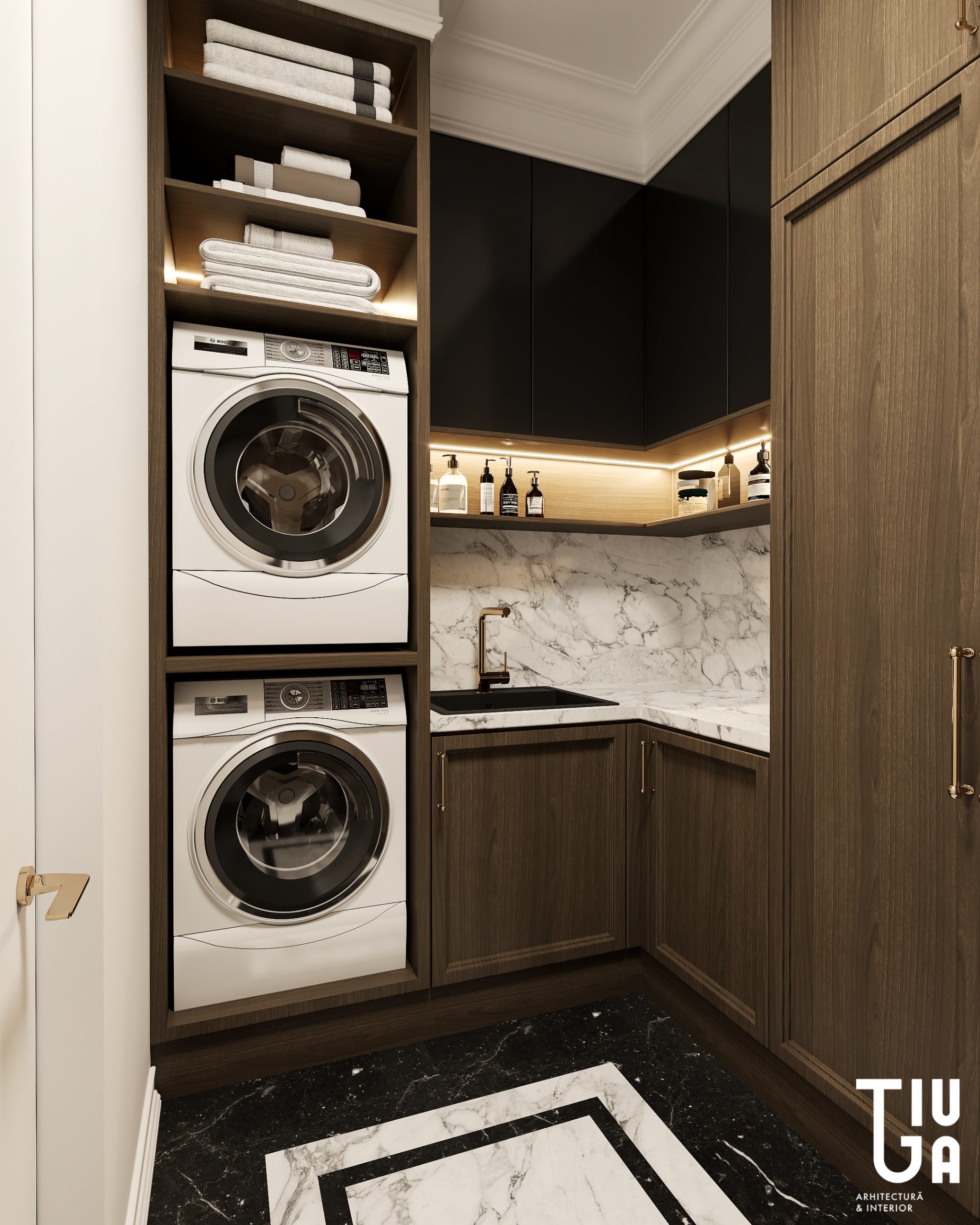 Pour conclure ce parcours spatial, la buanderie elle-même est traitée avec une rigueur architecturale. Son mobilier minimaliste, son éclairage intégré et sa palette cohérente assurent une continuité parfaite avec le langage global du projet.
