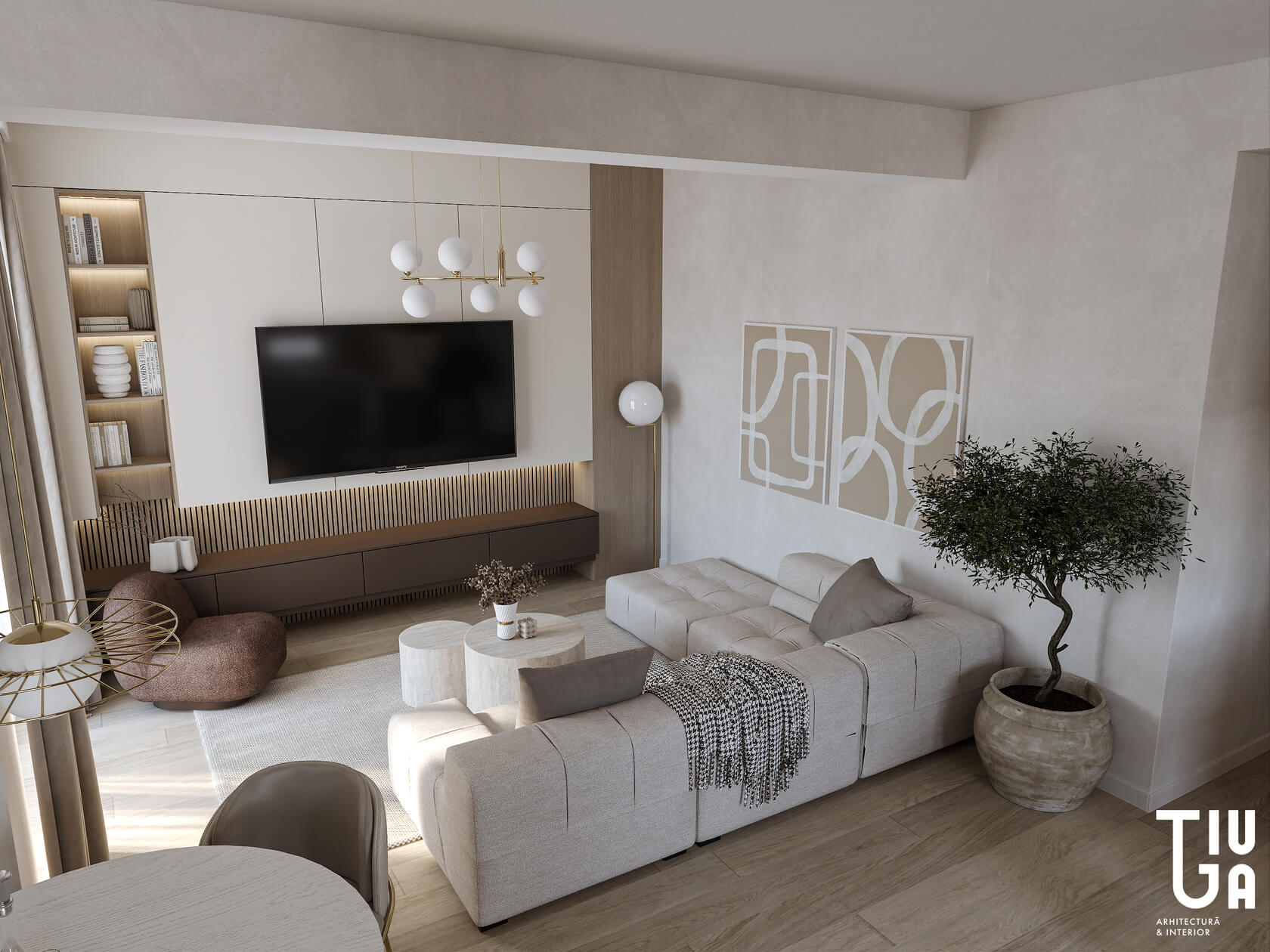 Le projet de design d'intérieur de TIUGA STUDIO présente une esthétique raffinée et cohérente dans toutes les pièces, mettant l'accent sur l'élégance, la texture et la fonctionnalité. Le design adopte une palette de couleurs neutres, avec des tons doux de beige, crème et taupe, complétés par des teintes boisées chaudes et des touches de accents dorés. Cette combinaison apporte chaleur et sophistication, créant une atmosphère accueillante.